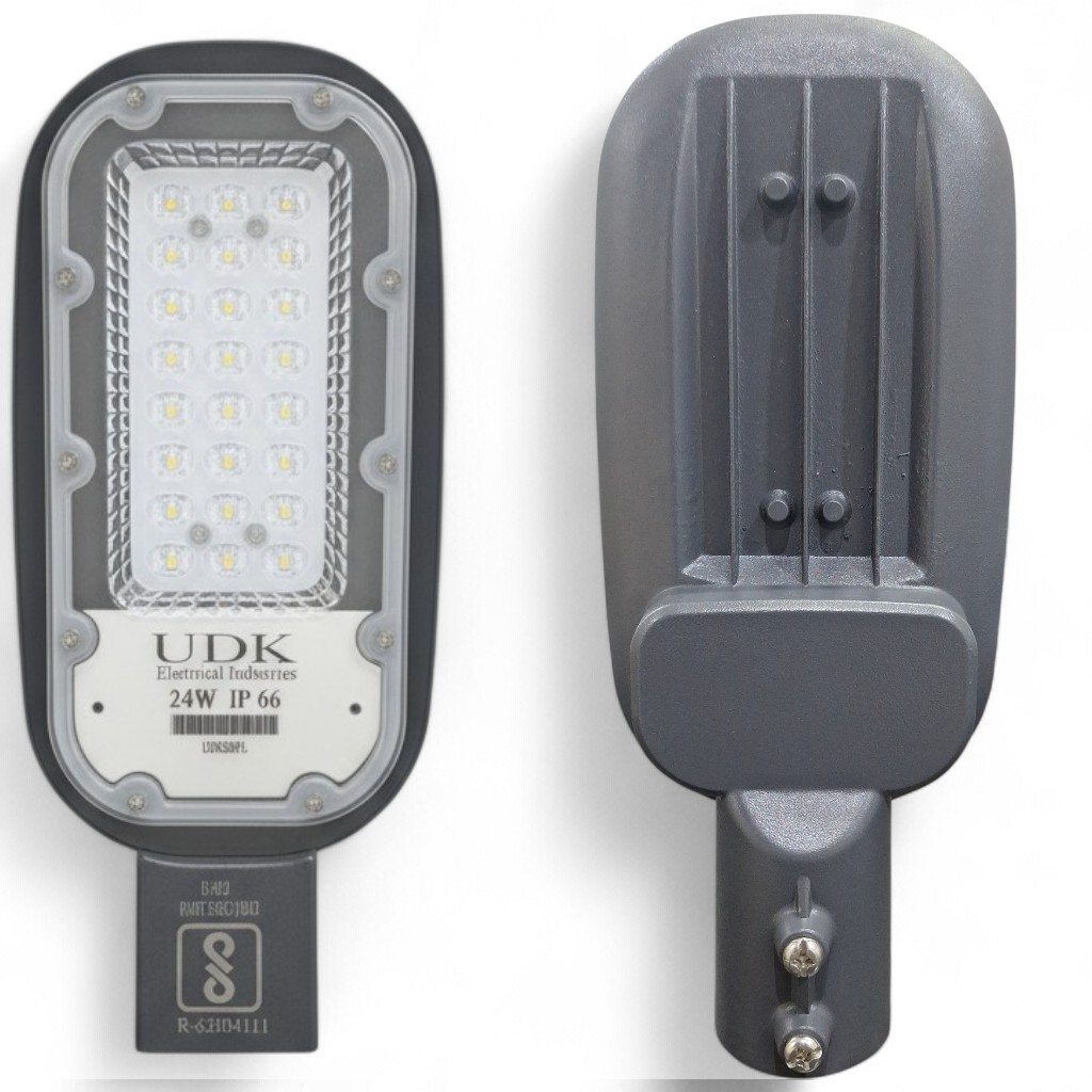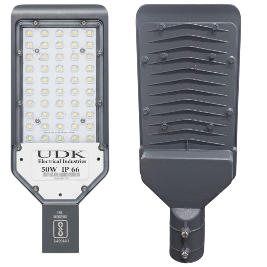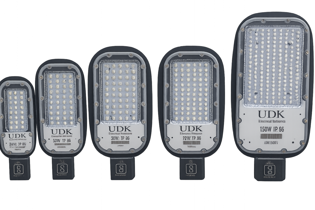 UDK Electrical Industries offers Glass Model LED Street Lights in multiple wattages such as 24W, 36W, 50W, 100W, and 150W to suit different road and industrial lighting requirements.