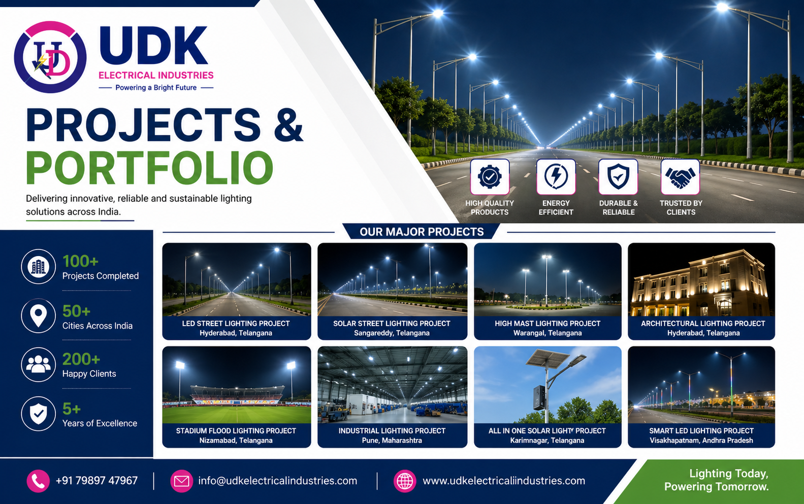 At UDK Electrical Industries Pvt. Ltd., we take pride in delivering high-performance LED lighting solutions across residential, commercial, industrial, and government applications. Our portfolio showcases our expertise in LED street lights, solar street lights, flood lights, industrial lighting, petrol bunk lighting, and customized OEM solutions.